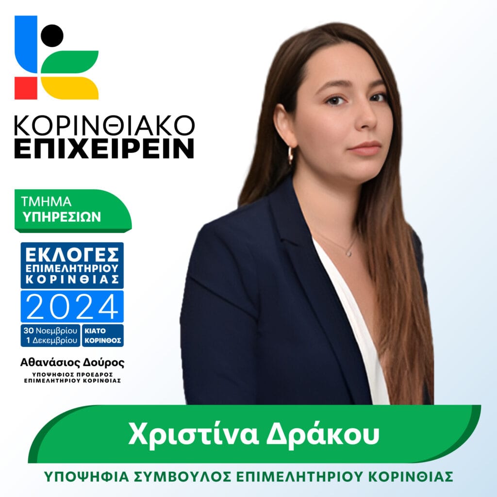 Η Χριστίνα Δράκου γεννήθηκε στο Χιλιομόδι Κορινθίας και διαμένει στα Ίσθμια. Είναι απόφοιτος του Τμήματος Φιλολογίας του Πανεπιστημίου Πατρών, με κατεύθυνση στις Νεοελληνικές και Ανθρωπιστικές σπουδές. Έχει παρακολουθήσει εξειδικευμένα σεμινάρια στο Strategic HRM, Leadership & Entrepreneurship, Business Communication Skills και στρατηγικές για τη δημιουργία και διατήρηση ανταγωνιστικού πλεονεκτήματος, ενώ είναι κάτοχος πτυχίου αγγλικής γλώσσας με πιστοποίηση Business English.
